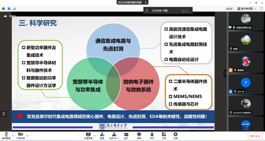 为帮助考研学子深入了解开云体育官网相关专业及报考情况,开云体育官网 肖建副院长从历史沿革、开云体育官网 基本情况、开云体育官网 发展规划等方面对开云体育官网 情况进行了介绍,对开云体育官网 招生信息进行了解读。他表示同学们在备考过程中要有明确的报考目标,并对其做相对详细的了解,希望同学们科学备考,一战成硕,成功上岸!电子与光学工程开云体育官网 、柔性电子(未来技术)开云体育官网 李卫副院长从发展历程、师资建设、学科建设等七个方面对开云体育官网 基本情况进行了介绍。他结合往年数据对开云体育官网 招生情况进行了客观分析,并强调考研是个策略性问题,在做选择时要多加注意,并预祝各位学子2023年考研成功!