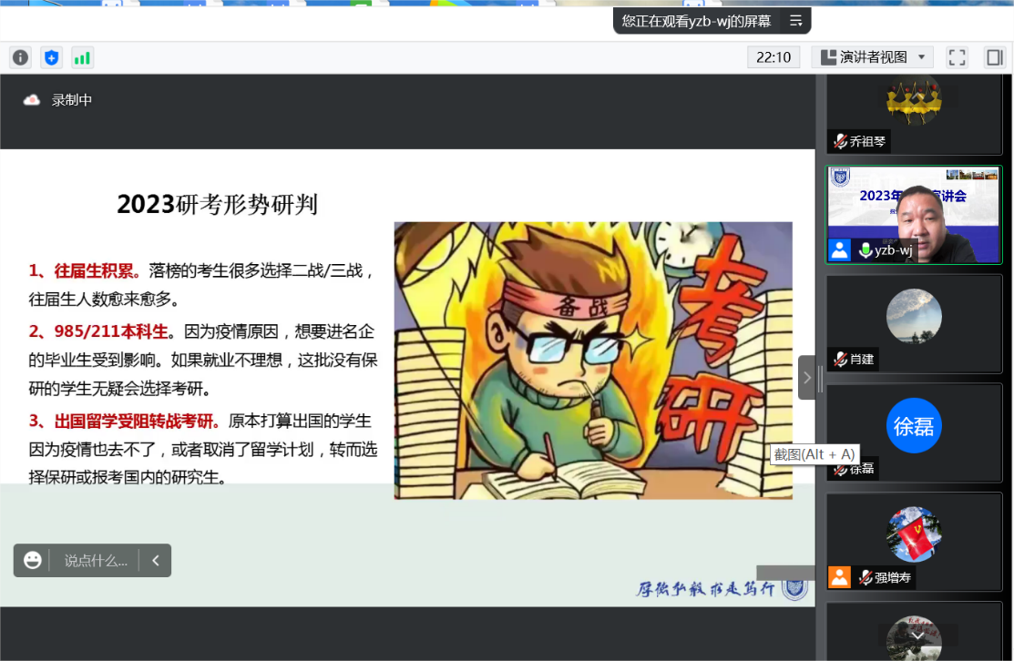 党委副书记、副院长乔祖琴,副院长肖建参加会议,会议采用线上方式开展,由乔祖琴副书记主持,两院2023届考研学子积极参会。