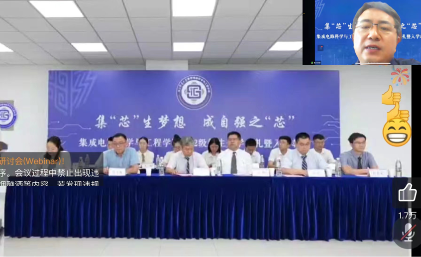 导师代表刘轶教授在云端与大家相会并发言。万丈高楼平地起,刘教授强调同学们要踏踏实实,从一点一滴做起,把握大学阶段的学习特点和规律,做好自我设计,确定阶段目标,尽快调整心态,在学好专业知识的前提下锻炼独立的科学思维能力。刘教授还带领同学们展望了芯片产业的广泛应用前景。