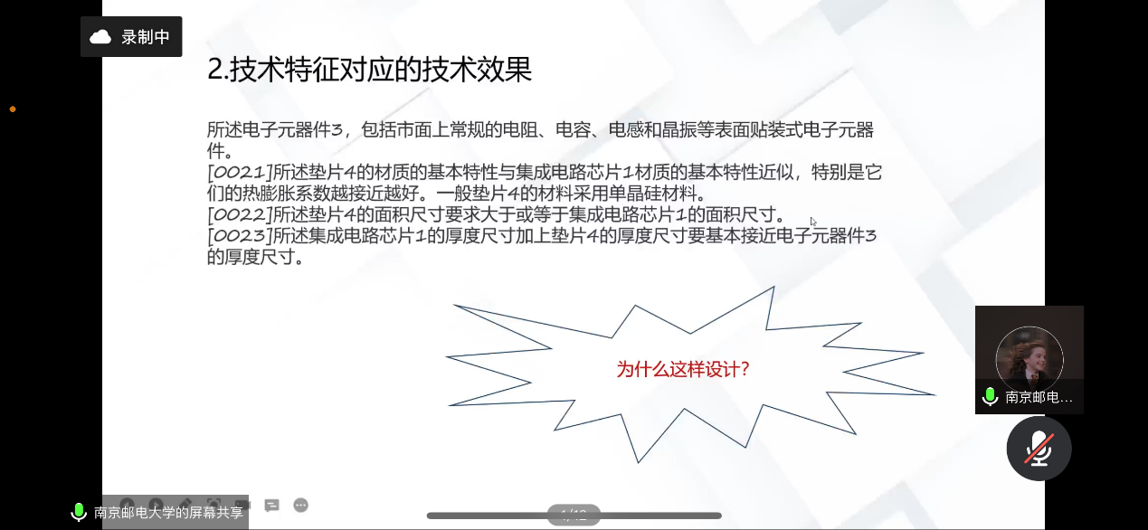 许婉静经理首先介绍了高价值专利的概念和评价标准,指出高价值专利需要有技术价值、法律价值、市场价值、战略价值和经济价值,并从说明书和权利要求书对专利进行评分,进而讲解了集成电路领域高价值专利的挖掘与布局,让大家意识到专利布局的重要性,可以从集成电路领域的各个产业链节、产品和技术点进行搭建和动态组合。此外,许经理详细阐述了高价值专利的培育与撰写,特别指出,要认真撰写技术交底书,在技术方案与技术问题和技术效果上具有完全对应的技术逻辑证明,并通过案例清晰地说明了如何提高专利授权率。随后,多位老师就自己在专利申请中遇到的问题进行了深度交流。