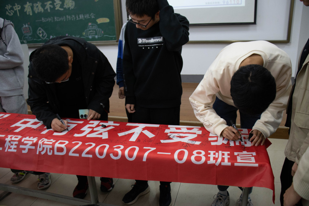 再次,由朱叙同学主持防诈知识竞赛环节。班级同学结合生活经验及班会所学积极抢答,现场氛围十分热烈。最后,班级同学依次在防诈宣传标语横幅上签字,进一步承诺自觉拧紧防诈安全意识这根“弦”。
