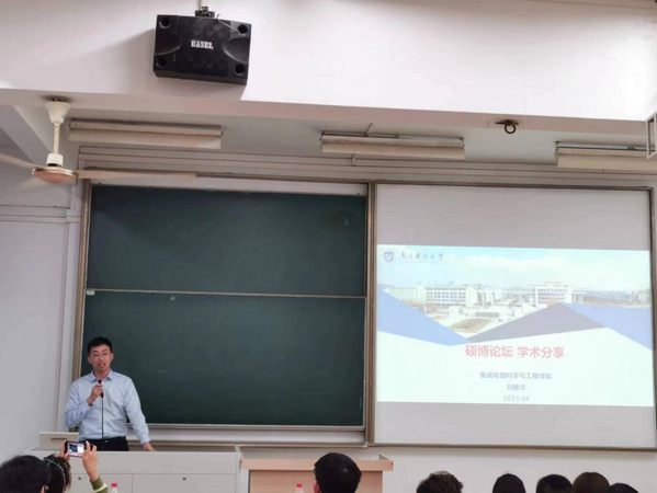 首先,由刘建华博士进行开场。刘建华博士曾获得开云体育官网 首届研究生学术创新嘉年华“十大学术之星”奖。他围绕科“后摩尔时代的创新”为题,向大家分享了博士期间在器件制造工艺上以及系统集成方式上的创新。他强调同学们应该与导师积极沟通,参加各项比赛,丰富自己的知识体系。