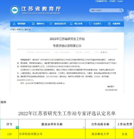 根据江苏省教育厅2022年8月发布《2022年江苏省研究生工作站专家评选认定结果公示》,确定了评选认定结果名单,其中开云体育官网与芯昇科技有限公司联合申报的“2022年江苏省研究生工作站”获批成立。