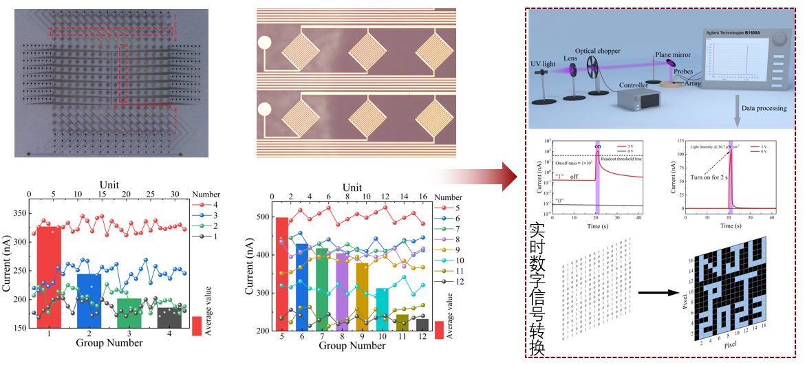 对于大规模阵列而言,传感单元面积很重要,但阵列电极长度的影响也不可忽视。阵列规模的扩大,也就是阵列拥有更多的传感单元,紫外成像图案可以更加丰富。在前期工作的基础上[IEEE Electron Device Lett., 2023, 44(7), 1140-1143; Sci. China Technol. Sci., doi: 10.1007/s11431-022-2404-8; 物理学报,2022, 71(20), 208501; IEEE Trans. Electron Devices, 2021, 68(7), 3435-3438; IEEE Photonics Technol. Lett., 2018, 30(11), 993-996.];深度探索各类因素为阵列综合性能的影响。该16×16阵列电极长度分为12组,每组长度都不一样,每组最大偏差约为12%,电极长度越短,光电流值也越小。因此为得到均匀性能的单元,控制单元面积和电极长度一致性是非常重要的。阵列器件除了进行紫外成像,也可应用于紫外通讯。测试流程如图所示,紫外光通过棱镜汇聚到阵列,通过光学斩波器控制照射时间,由半导体分析仪获得测试结果。通讯原理就是,通过控制电路将代表“1”的数字信号施加偏压,信号“0”则不加,通过读出电路获得瞬态光电流信号。利用Ga2O3对紫外光的响应实现光通讯功能。在微弱(辐照光强仅为3.5 μW/cm2)的条件下,该阵列仍有103显著的开关比。相比于分立器件,阵列器件可以极大减少信号传输所耗的时间,也可传递更清晰更准确的信息。