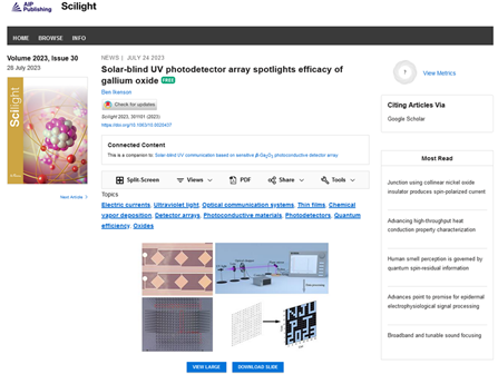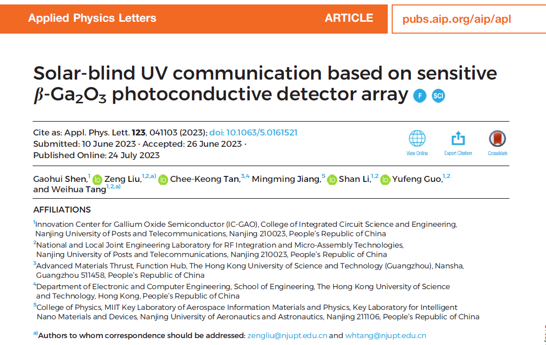 材料的价值在于生长优化后有效使用,器件的发展更不能离开半导体材料这一根基性的问题。宽禁带半导体Ga2O3由于其得天独厚的物理、化学特性,在诸多电子、光电子研究领域获得很高的重视。值得一提的是,其4.9 eV左右的禁带宽度使其有小于280 nm的截止波长,这使得利用Ga2O3制备的探测器能够实现极佳的波长选择性(也称抑制比)。唐为华教授团队立足Ga2O3的科研阵地,力求建立一个从材料到器件的多维度体系,其中融合多物理、多场以及多结构等动力学因素的调控与控制;研究工作获得国内外学术届的高度认可。其中,要满足器件对信息的大量采集和传输,制备相应的阵列型器件十分重要。这同时也对材料的品质和加工工艺等有着多重的严格要求。团队目前能够完成2/4/6英寸氧化镓外延薄膜的制备,2/3/4英寸单晶衬底的生长。而数据或者图片信息的采集与输运的准确度(还原度)在很大程度上依赖于阵列中像元的数量。近期,唐为华教授团队联合郭宇锋教授团队利用2英寸异质外延Ga2O3晶圆片,经过紫外光刻、剥离、蒸镀等微纳工艺制备256像素的Ga2O3阵列,首次报道了Ga2O3基晶圆级互联阵列日盲紫外通讯应用,是宽禁带半导体Ga2O3在光电集成应用领域的一项新进展。该项工作发表在AIP旗舰刊Applied Physics Letters上。被遴选为亮点文章,获得编辑推荐,并且被SCIlight报道。该工作创新性地完成了在处理更大信息量的基础上实现了基于高效的Ga2O3阵列的图形化通讯。论文第一作者为硕士生沈高辉,通讯作者为刘增副教授与唐为华教授。工作在与郭宇锋教授团队、香港科技大学Chee-Keong Tan教授与南京航空航天大学姜明明教授的密切合作下完成。