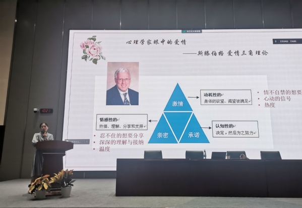 随后,胡老师介绍了心理学家眼中的爱情——斯滕伯格爱情三角理论,将亲密、激情和承诺看作爱情三角形的三条边,三角形的面积代表爱情的质与量,面积越大,爱情就越丰富。