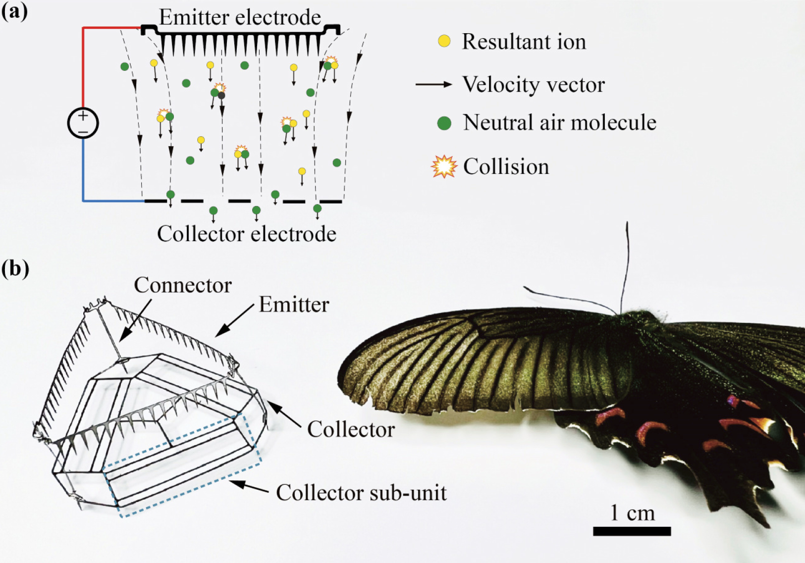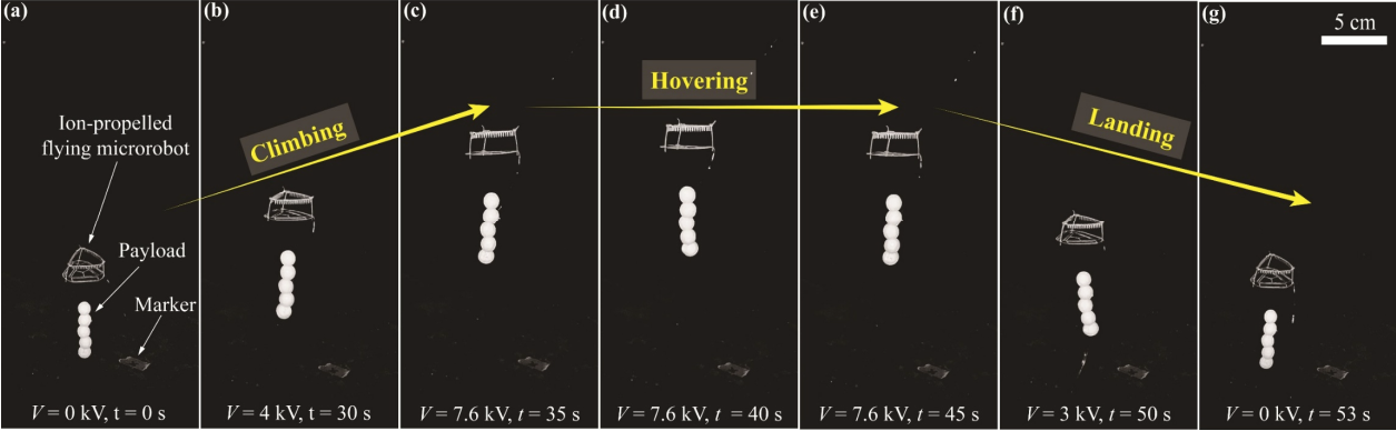 论文《Microrobotic Flight Enabled by Ultralight Ion Thrusters with High Thrust-to-Weight Ratio and Low Fabrication Cost》展示了团队在微型飞行机器人领域的最新研究成果。论文通过理论、多物理场建模和实验验证相结合的方法,创新研制了一种基于离子推进的体积小、质量轻、推重比大、成本低的新型微型飞行机器人。该机器人具有巨大的工程应用价值,可用于灾后救援、军事侦查、大型建筑物监测、探月工程等领域。论文第一作者为开云体育官网 硕士研究生顾洋,蔡先法副教授为并列第一作者,通讯作者为郭宇锋教授、李巍教授。开云体育官网 为论文第一署名单位。