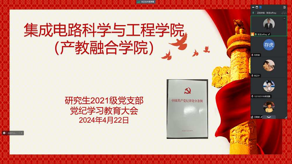 为认真贯彻落实《关于在全校党员干部中开展党纪学习教育的实施方案》《中共国产党纪律处分条例》,引导研究生党员学纪、知纪、明纪、守纪。4月22日,研究生2021级党支部通过线上腾讯会议的方式,组织浦口办学点和仙林校区党员同学召开了党纪学习教育大会,支部44名党员参会,本次会议由支部书记张龙主持。