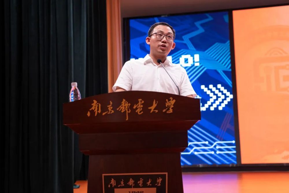新生家长代表严鑫发言,他首先表达了对同学们圆梦南邮的真诚祝贺和对老师们的由衷感谢。他站在上一辈的求学者、奋斗着的角度,向同学们提出了三点期待:在求学路上不骄不躁、保持谦卑与上进;全面发展自身,培养丰富的兴趣爱好;将理论联系实际,深入社会和群众,心系国家发展。他希望孩子们永葆“独立之精神,自由之思想”,生活有味、学有所成,开启崭新的学习生活。