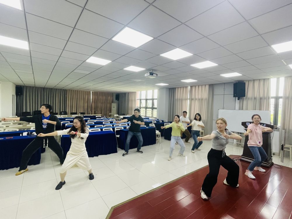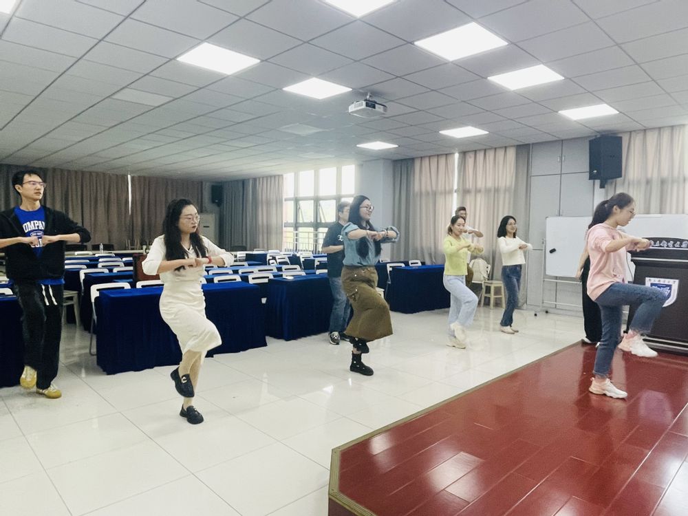活动现场,负责同志一边讲解着口诀,一边将动作进行分解,耐心细致的手把手指导大家练习技巧,大家在充满活力的背景音乐中跟着节奏,认真专注地比划着一招一式,在欢声笑语中互相交流学习着、领悟着。短短30分钟的练习,让老师们在繁忙的工作中充分舒展身筋、畅通经络,达到了缓解疲劳、释放压力、活动身心的健身效果。