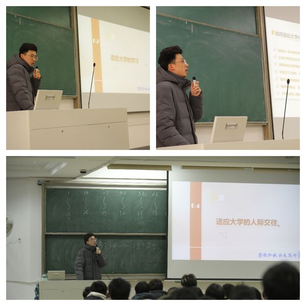 随后,范老师以“大学生活,你适应了吗?”为题,结合入校后“三进三谈三联”工作中发现的大一新生适应问题,从适应大学的学习、适应大学的人际交往和适应大学的心理三个方面提出了包括给自己一段冷静思考的时间、认清大学的生活状态、为自己订立目标,规划好未来的大学生活等具体建议,帮助新生更好地解决适应问题,尽快适应大学学习和生活,把握好未来发展方向。