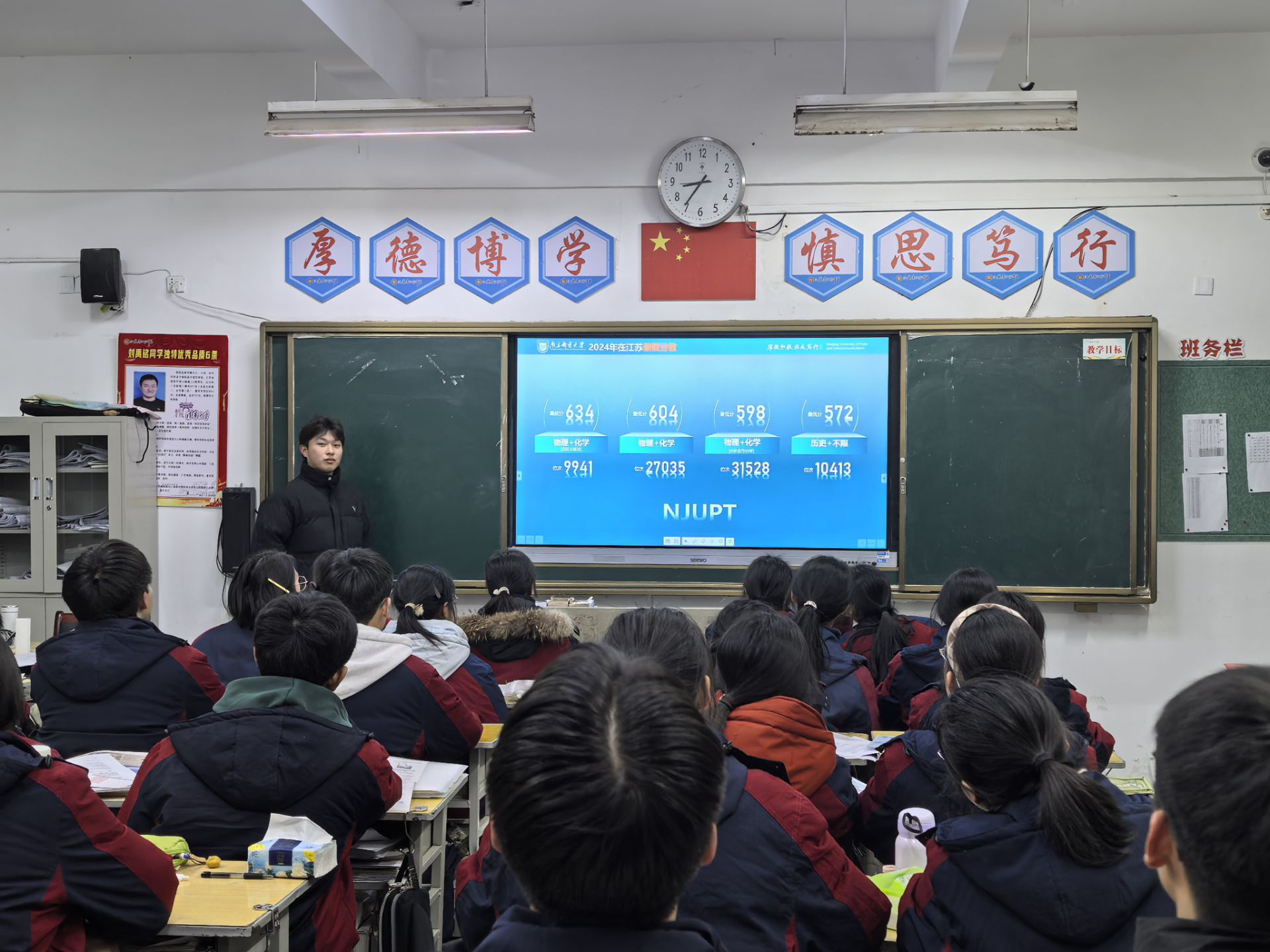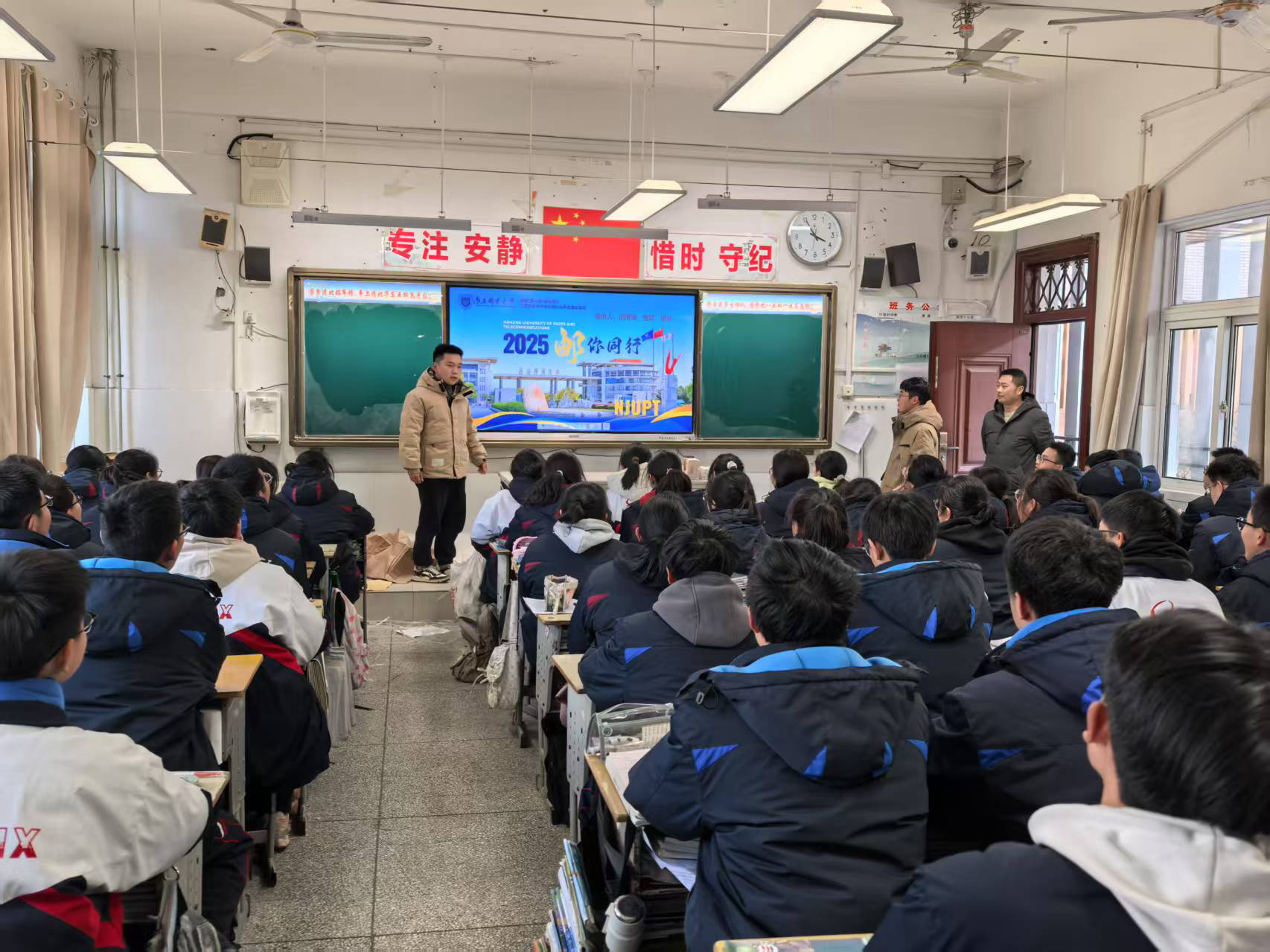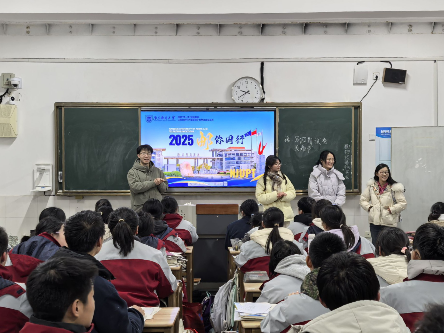 寒假期间,胡清潇同学回到母校——沭阳如东中学,为高三学子带来了一场别开生面的大学宣讲会,宣讲会上,胡清潇以“我的南邮,你的未来”为主题,通过精心制作的PPT和生动有趣的视频,向学弟学妹们展示了南邮的校园环境、学科优势、师资力量以及丰富多彩的校园生活。“大学是人生的新起点,充满了无限可能。” 胡清潇鼓励学弟学妹们要珍惜高中时光,努力学习,为梦想而奋斗。他还分享了自己备战高考的经验和心得,并耐心解答了学弟学妹们关于大学生活、专业选择等方面的疑问。