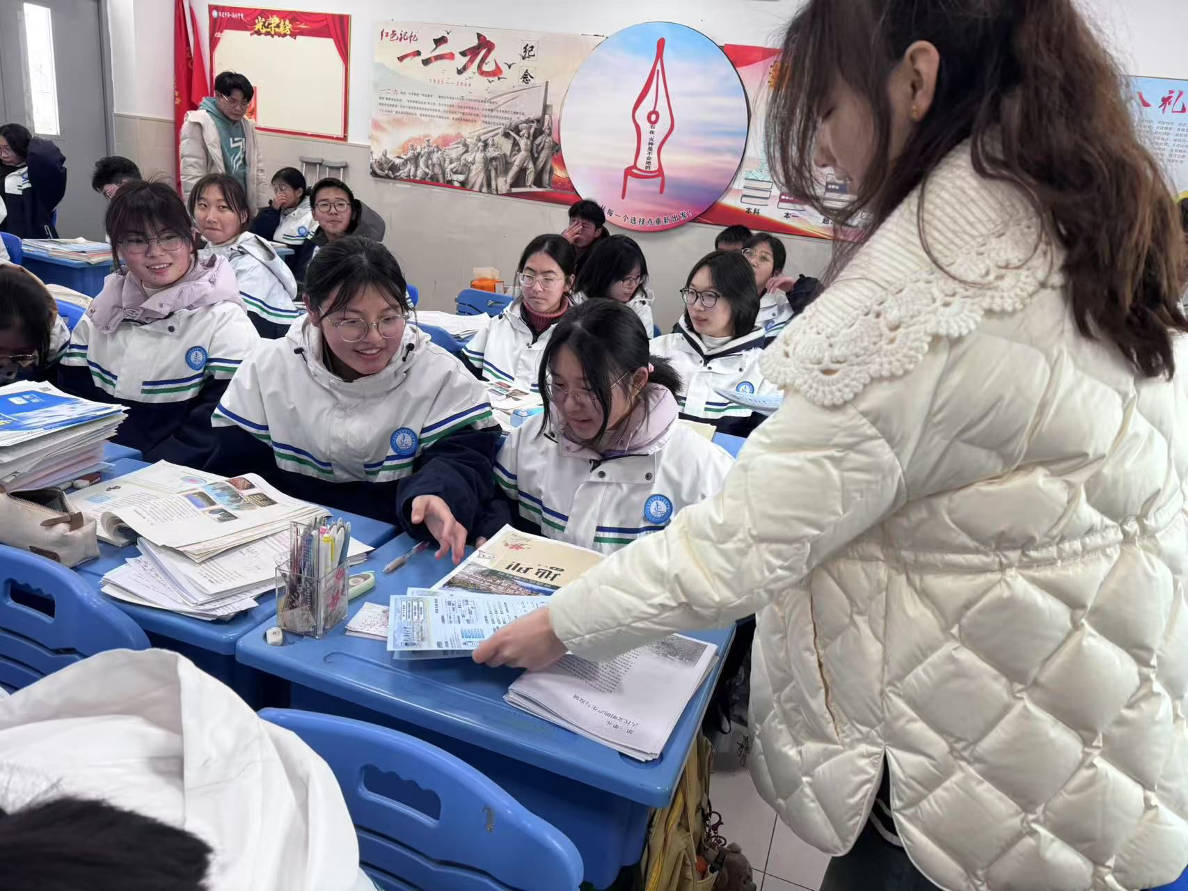 活动期间,团队成员走进高三重点班级,通过精心制作的PPT全面展示南邮的学科实力与校园文化。宣讲内容涵盖信息与通信工程等国家一流学科建设成果、“红绿蓝”三色育人的思政教育品牌、5G实验室和科创竞赛等特色。为增强互动性,团队设置问答环节,针对高考备考、专业选择等问题现场答疑,并发放百余份南邮招生简章及定制文创礼品,内含南邮主题明信片、校徽书签等,吸引了大量学子的关注。本次活动创新采用“学长学姐零距离对话”模式,团队成员结合自身经历,分享从泗洪中学到南邮的成长故事。
