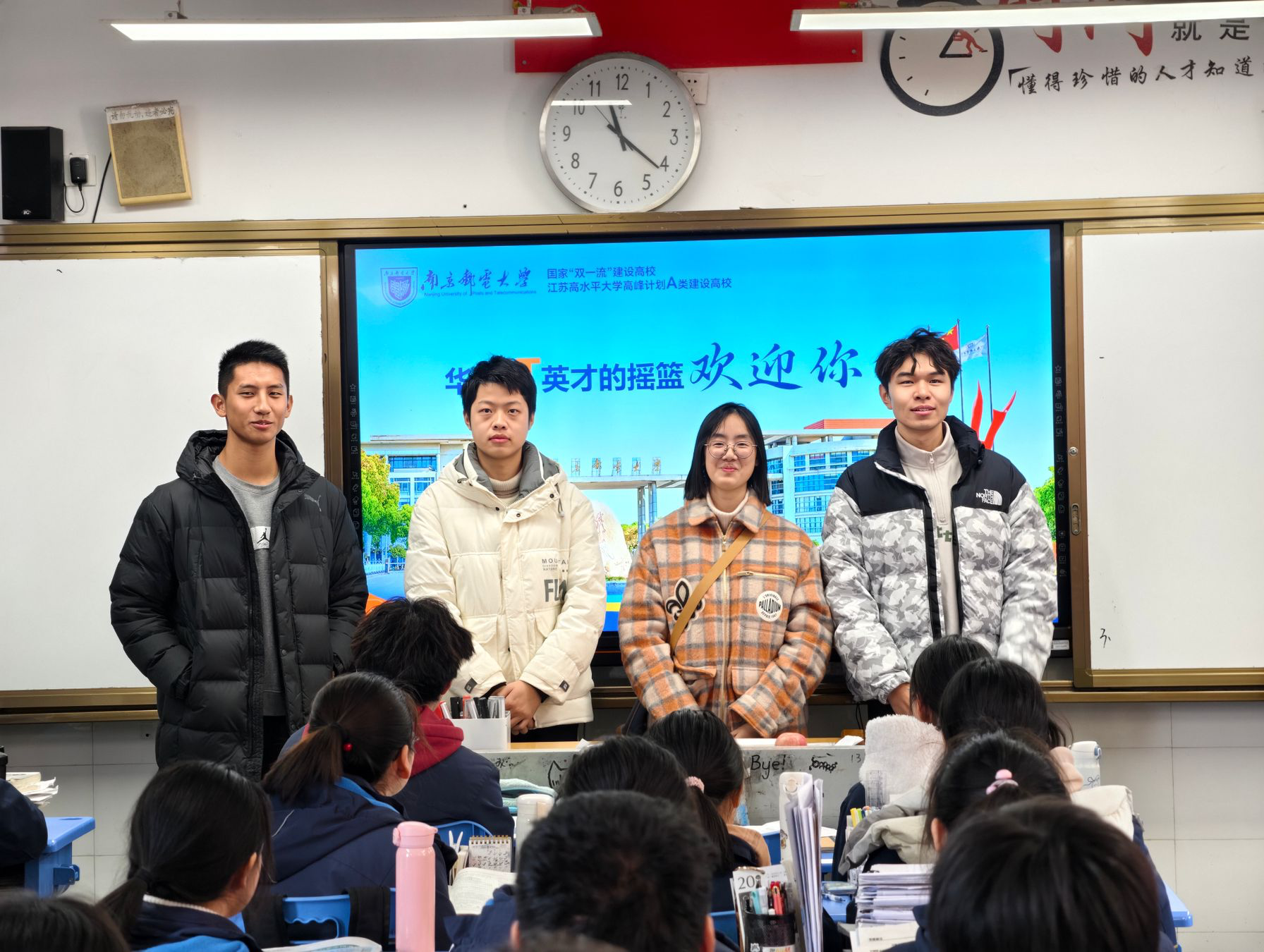 “作为泗洪中学的毕业生,能以‘南邮人’的身份重回母校,既是荣誉更是责任。看到学弟学妹们眼中闪烁的憧憬,我深切体会到传递梦想的力量。未来,我们将继续以行动为南邮代言,为更多学子架起通向信息时代的桥梁。”——2024级本科生马梓翔