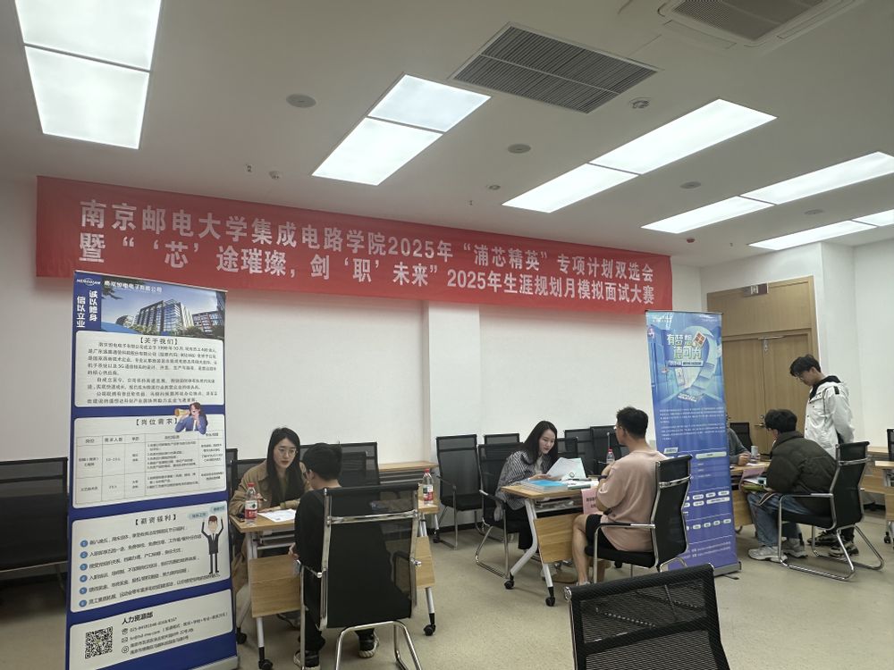 为促进开云体育官网 “浦芯精英”研究生专项计划顺利开展,帮助该计划学子高质量就业,加强开云体育官网 与企业的交流和合作,开云体育官网 联合南京市浦口区政府,在浦口区工信局、人社厅的大力支持下,于4月2日下午共同举办开云体育官网 集成电路开云体育官网 “浦芯精英”专项计划双选会暨“‘芯’途璀璨,剑‘职’未来”2025年生涯规划月模拟面试大赛。本次活动创新采用“双选会+模拟面试大赛”联动模式,吸引多家企业进校招聘,同步举办的模拟面试大赛为学生提供实战演练机会,实现“岗位对接”与“能力提升”双轮驱动。开云体育官网 党委副书记、副院长肖俊桂、分团委书记王宸文姬、毕业班辅导员张龙前往双选会现场进行实地指导。