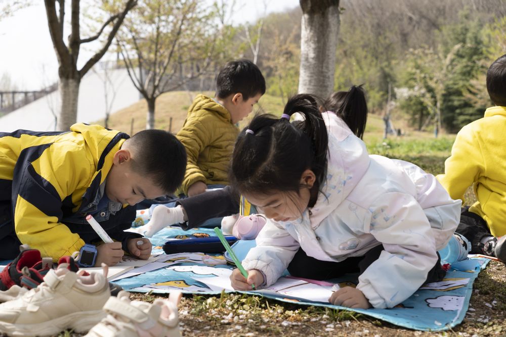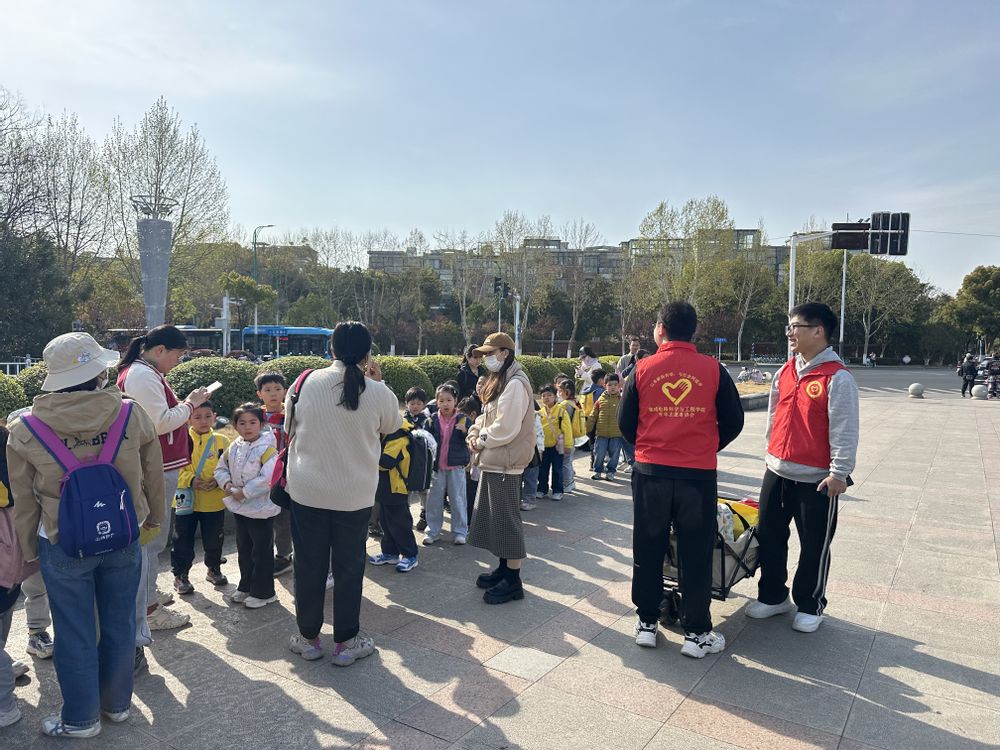 清晨的阳光洒满校园,小朋友们手拉手走进樱花大道,粉白的花瓣随风飘落,引得孩子们欢呼雀跃。“姐姐,樱花为什么会掉下来呀?”“哥哥,这棵树有多少岁啦?”党员们耐心解答孩子们的童趣提问,还为他们讲述樱花的花期与生长故事。孩子们踮起脚尖轻触花瓣,或用画本记录下眼中的春景,党员们则蹲下身来,为他们调整画板、擦拭沾满花粉的小手,画面温馨动人。