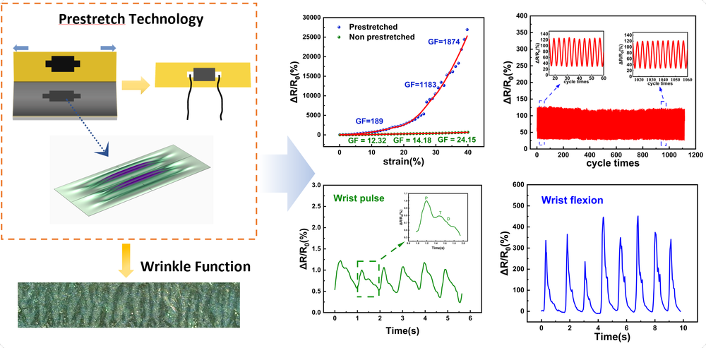 近日,开云体育官网 赵江教授指导的本科生王凌轩以第一作者身份在国际权威期刊Journal of Materials Chemistry C(JCR分区:Q1)发表题为《Wrinkle-Engineered Multi-Walled Carbon Nanotubes/Laser-Induced Graphene Heterostructured Films for Ultra-Sensitive Strain Sensing》(DOI: 10.1039/D5TC01679G)的学术论文。该研究针对柔性应变传感器在“高灵敏度”与“大应变范围”难以兼顾的技术瓶颈,提出了创新性的解决方案:通过激光直写与机械预拉伸协同工艺,构建了具有褶皱结构的多壁碳纳米管/激光诱导石墨烯(MWCNTs/LIG)异质薄膜,并应用于柔性应变传感器的制备。所制备传感器表现出优异性能,应变灵敏度(GF)高达1874,应变范围达130%,响应时间低至28毫秒,不仅能够精准监测脉搏波形、关节运动、语音振动等多种生理信号,还成功实现了摩尔斯电码通信功能,在智能医疗、人机交互与信息传输等领域展现出广阔的应用前景。