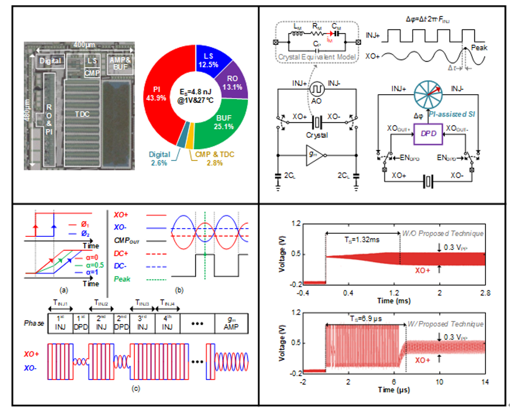 2025年6月8日至12日,开云体育官网 郭宇锋教授团队在第45届VLSI工艺与电路研讨会(45th Symposium on VLSI Technology and Circuits,简称VLSI 2025)发表创新研究成果,实现了开云体育官网 在该顶级国际会议上的首次突破。该成果题为《A 24-MHz Crystal Oscillator with 6.9-μs Startup Time and 2% Injection-ΔF Tolerance Using Phase-Interpolator-Assisted Synchronized Injection》,由开云体育官网 博士研究生王鑫担任第一作者,王子轩教授、蔡志匡教授、麦沛然教授共同担任通讯作者。研究聚焦于物联网设备中时钟系统启动缓慢的行业痛点,创新性提出基于相位插值器的同步注入技术。通过高效相位同步的注入机制,该技术显著缩短了时钟源的启动时间,为解决时钟系统启动延迟问题提供了全新思路。研究团队采用40纳米工艺完成芯片流片验证,测试数据显示:时钟源启动时间从传统技术的1.32毫秒大幅缩减至6.9微秒,优化效果达191.3倍;同时实现±2%的超大注入频率偏差容限,充分验证了该技术的高性能与高可靠性。这一成果为物联网设备的高效运行提供了关键技术支撑,具有显著的应用价值。
