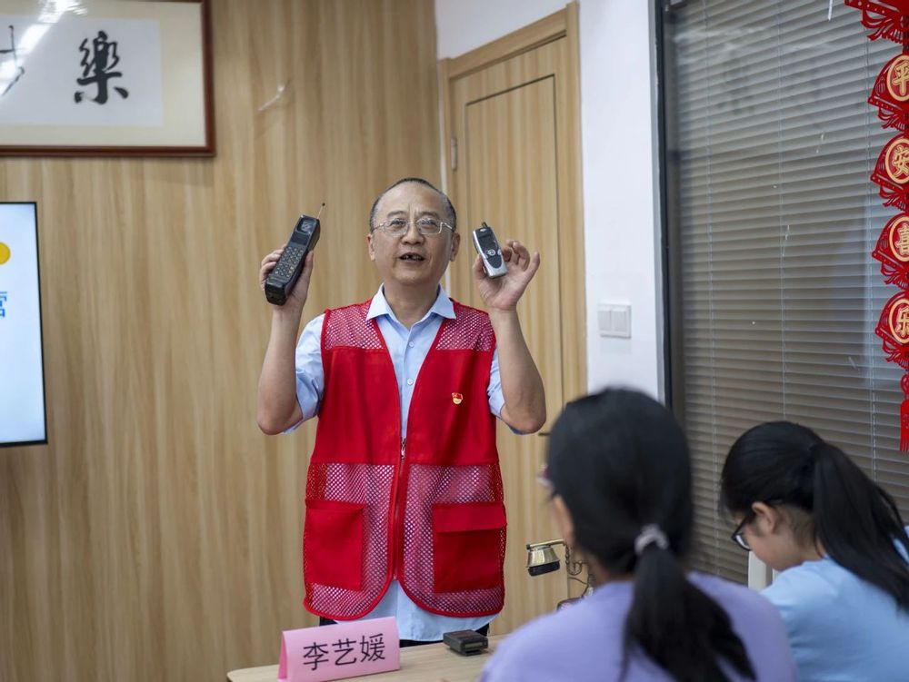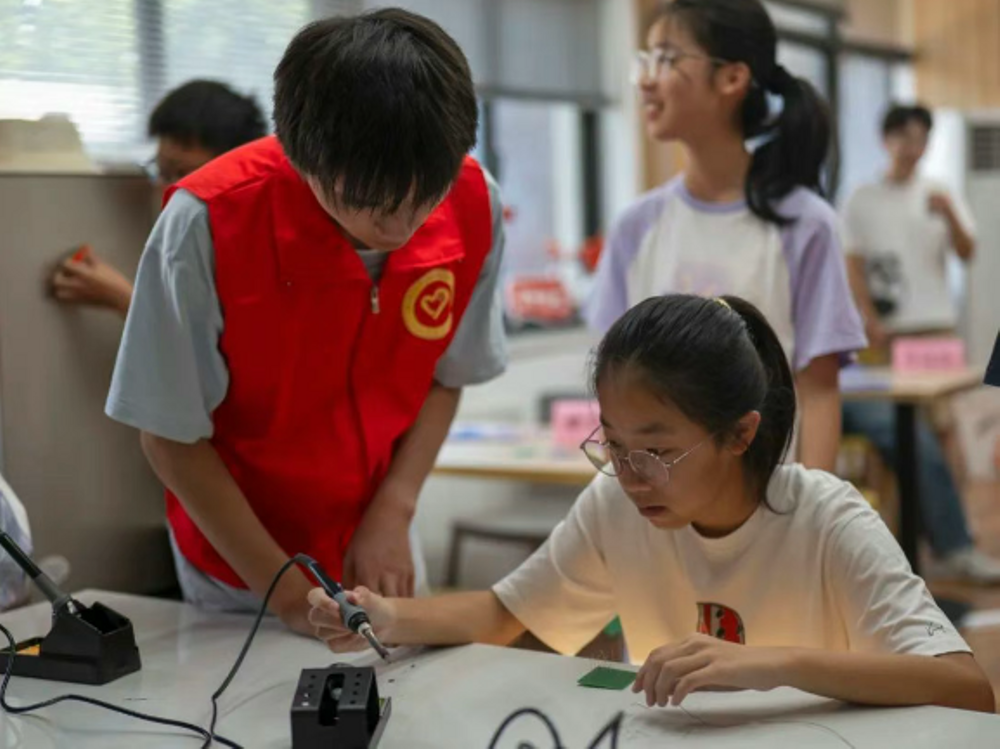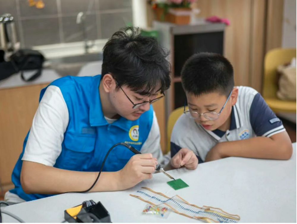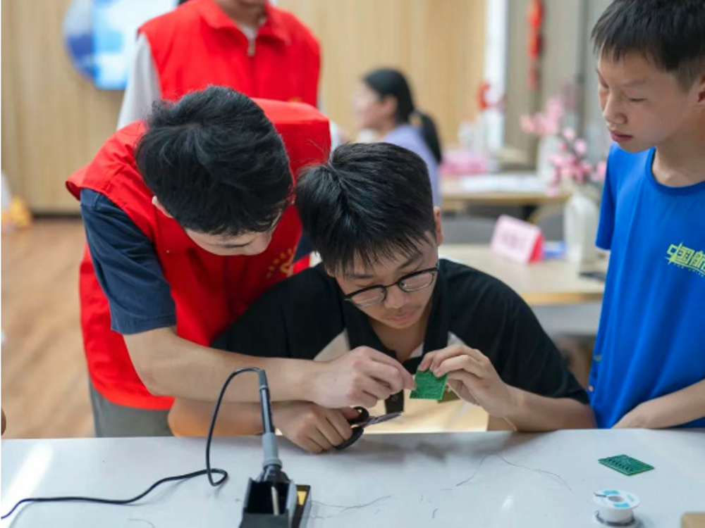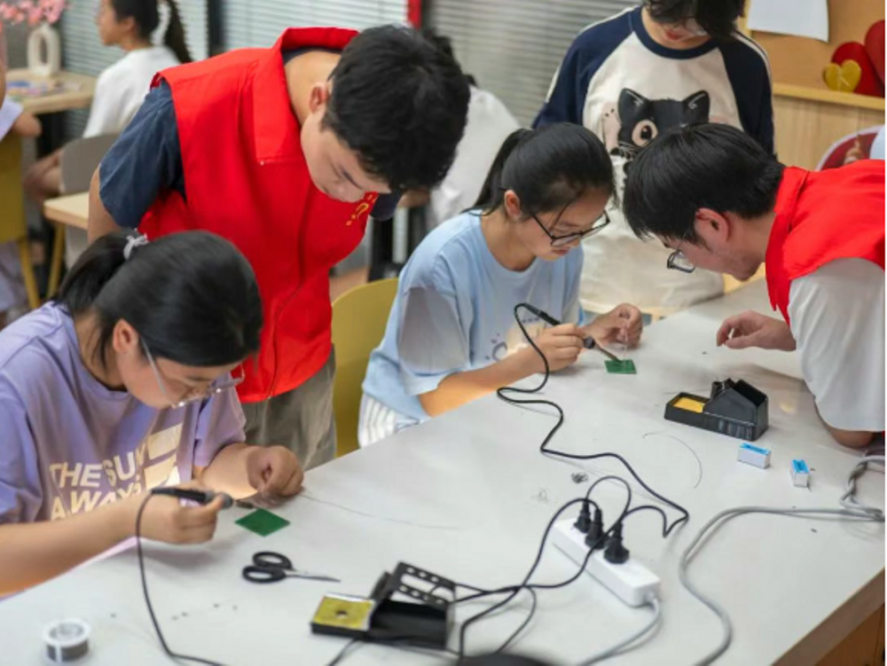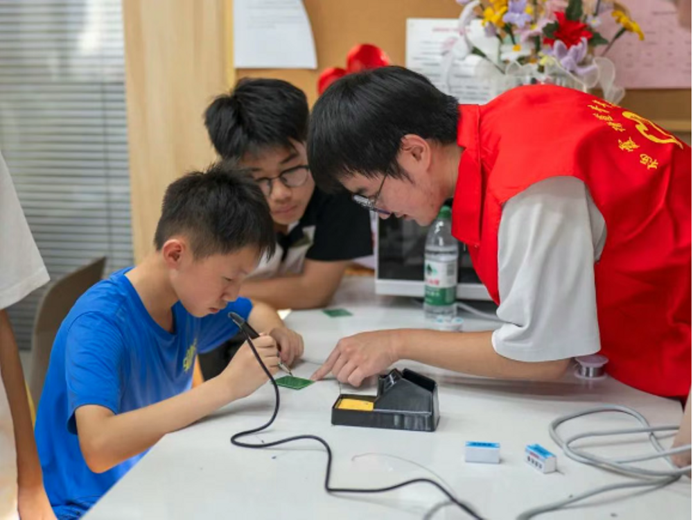 与科技同行,童心筑梦播撒创新火种。夏令营以“做中学、玩中悟”为特色,通过“芯片探秘”、“电路工坊”等互动课程,让社区青少年亲自体验了电子元器件的焊接,体验了电路板“化零为整”的创造乐趣。为了让大家更直观地了解通信技术的发展,社区“幸福由我”工作室老党员丁旱雨还从家中带来了珍藏的传呼机、“大哥大”、老式电话机和按键手机,进行实物展示和讲解。孩子们不仅直观感受到了小小芯片撬动社会变革的能量,还深刻体悟到“科技报国”的时代分量,心中理想的火种被悄然点燃。