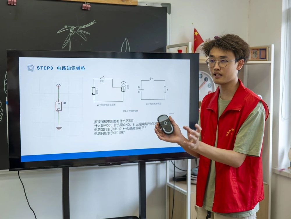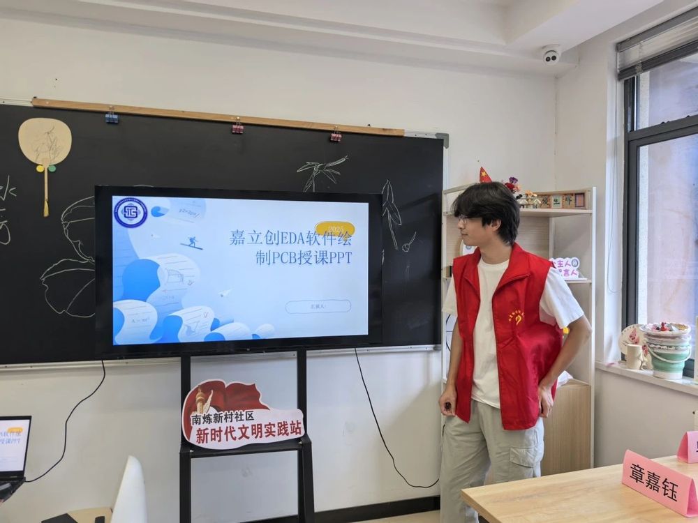 与时代同行,集成学子践行科教使命。同学们化身“科技领航员”将专业知识转化为科普实践,从芯片的应用场景切入,以动画短片、漫画绘本与实物模型展示,带领青少年探秘微观芯片世界。实践环节,志愿者以小组为单位全程指导,教授EDA知识和进行电路设计、绘制方法。小学员认真记录操作步骤与问题解决过程,随着“试错-调整-优化”的循环学习,大家的逻辑思维与工程思维得到进一步强化,也将抽象的电路原理转化为可验证的实践成果,成功制作出流水灯。