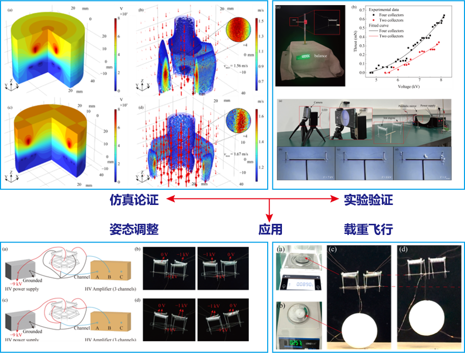 针对上述挑战,研究团队基于多物理场耦合仿真技术,设计并优化了一种基于针-板电极构型的多单元离子风推进系统,完成了推力性能与流场特性的分析和实验验证工作,研制了利用多单元离子风推进系统实现飞行和调姿的微机器人样机。所开发的离子风推进器单体重量仅18.1mg,推力0.66mN,单位体积推力达到261N/m3,推重比达到3.7。同时,团队开发的离子风推进器产生的离子风流束集中,有效克服了推进器在微机器人狭小空间内的气流干扰问题,为系统的集成与独立控制提供了关键优势。研究团队设计并制造了由多个优化引擎驱动的微型机器人原型,通过独立控制各单元,已可实现稳定起飞与飞行姿态调节,是离子风推进在微型机器人领域的关键技术突破与应用实例。