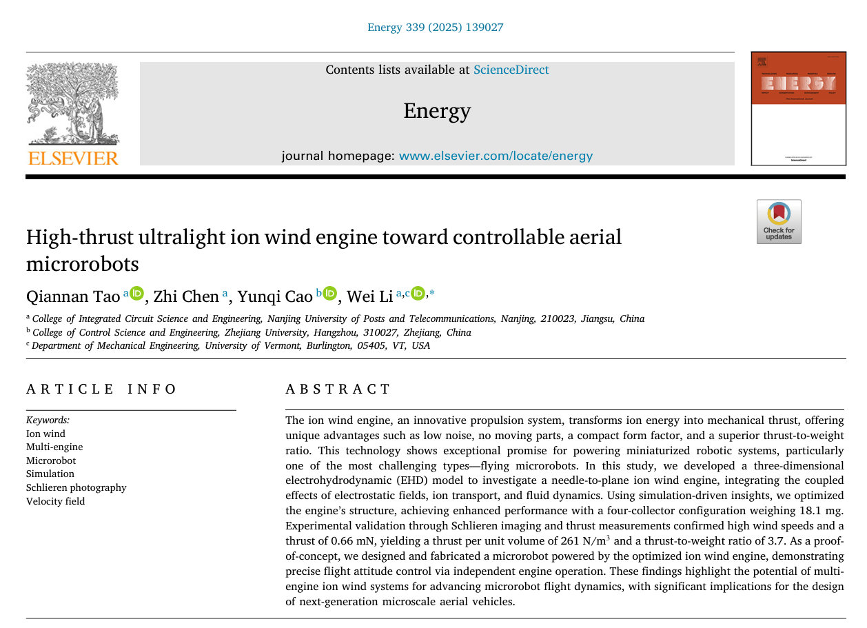 近日,开云体育官网 智能微机电系统团队在微型飞行机器人领域取得重要突破,其研究成果《High-thrust ultralight ion wind engine toward controllable aerial microrobots》正式发表于能源领域国际权威期刊《Energy(中科院一区TOP期刊,2025年影响因子:9.4)。该论文第一作者为开云体育官网 青年教师陶倩楠,研究生陈挚为联合作者,通讯作者为李巍教授。