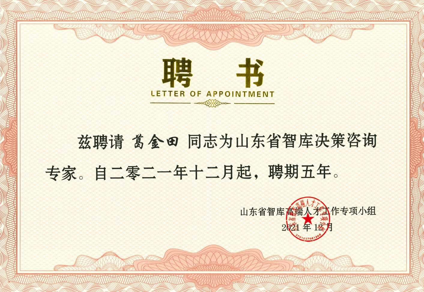 近日,接山东省智库高端人才工作专项小组办公室通知,标准化产业开云体育官网 院长葛金田教授被续聘为山东省智库决策咨询专家,聘期自2021年12月算起,为期五年。