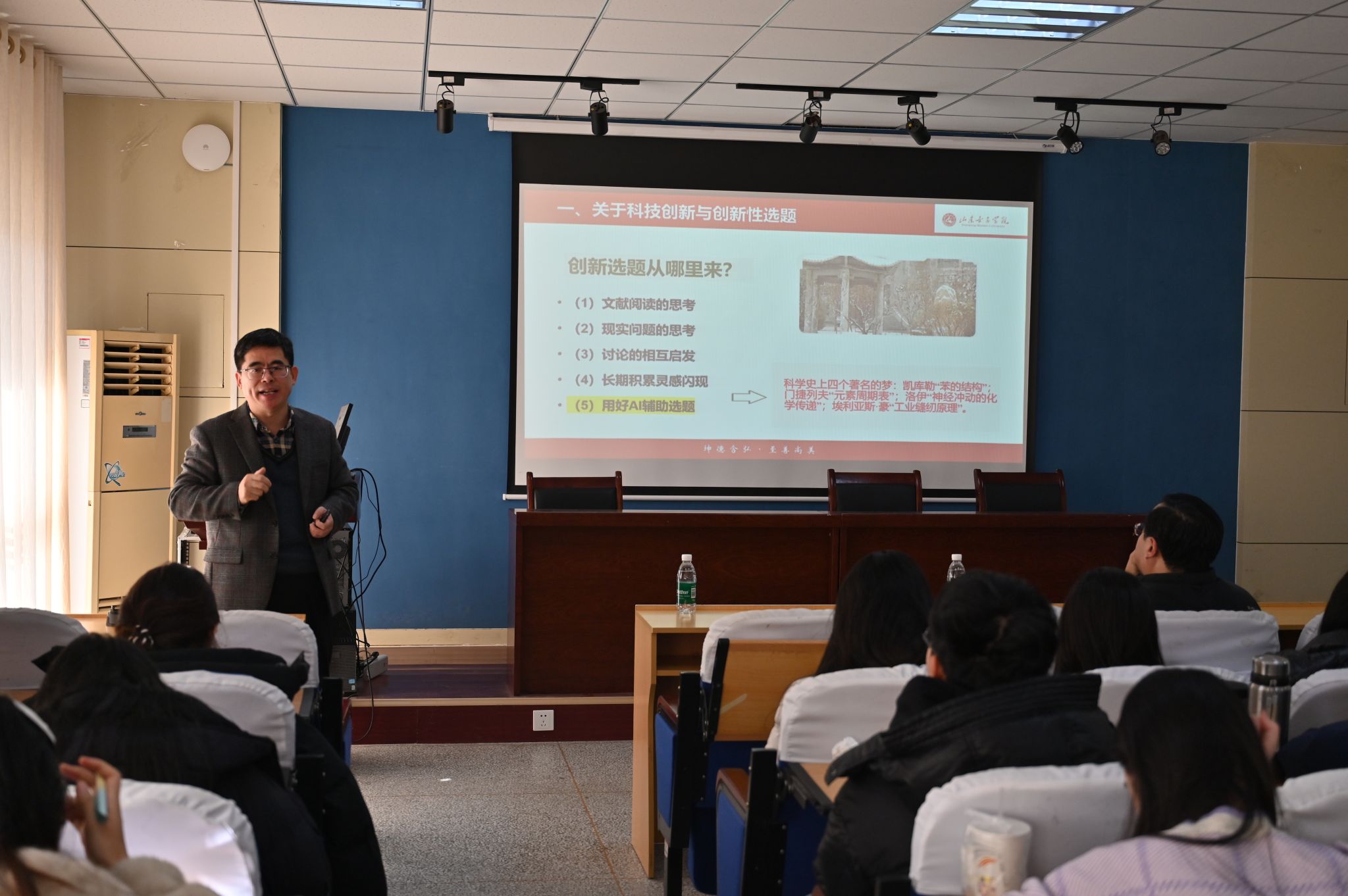讲座中,尹教授首先阐释了创新的核心内涵——创造新事物、提出新理念,或是对现有事物的改进与新矛盾共同体的构建,强调科技成果创新需实现“有所发现、有所发明、有所创造、有所前进”。同时,尹教授梳理了创新的不同层次,从开创新学科、新理论体系,到补充完善现有成果,再到修正旧结论、得出新观点,让师生对创新有了更立体的认知。针对硕士学位论文创作,尹教授指出创新性是核心要求,论文需体现作者独立思考,达到发表水平,分享了“中间开花”的论文写作步骤。在“如何创新”的问题上,尹教授对比了原始创新与模仿创新的路径,提出可结合国际/国内前沿方法解决中国问题,也可通过新方法对接新问题、旧方法挖掘旧问题新角度等方式实现创新。而创新选题的来源同样多元,既可以从文献阅读、现实问题思考中提炼,也能通过交流讨论激发灵感,或是依靠长期积累迎来灵光闪现,同时也可借助AI工具辅助选题,为师生打开了选题思路的新视野。