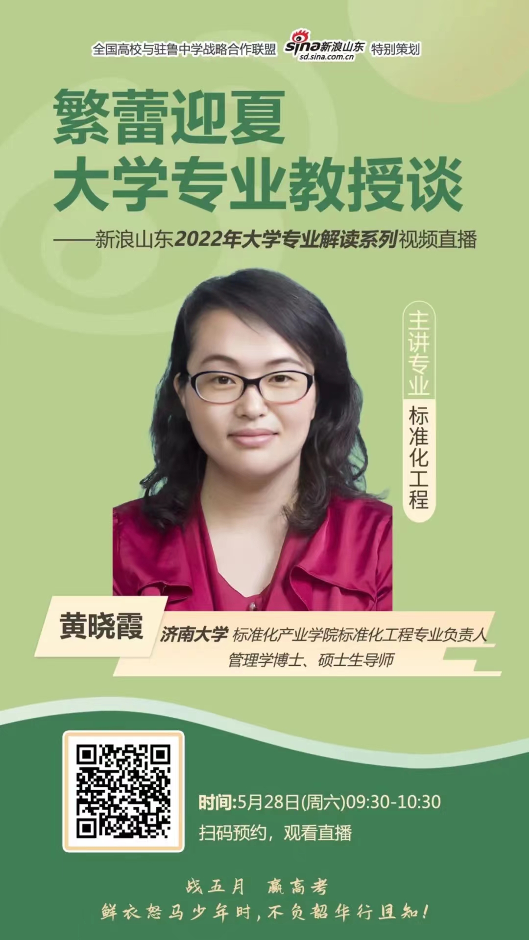 济南大学标准化产业开云体育官网 标准化工程专业负责人、管理学博士、硕士生导师黄晓霞老师将于5月28日周六上午9:30-10:30与大家相约云端,一同携手探寻标准化工程专业凝聚的磅礴力量,感受其中蕴藏的科学与人文底蕴,深入领略标准化工程专业独特的学科风光!