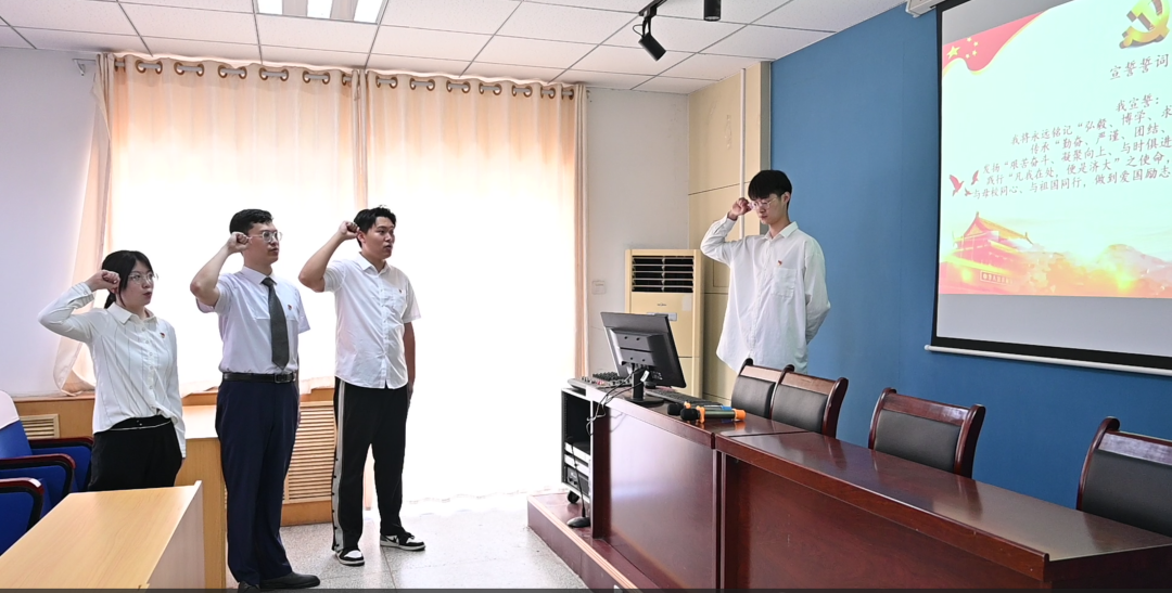 标准1901三位党员同志,在曹豪洋同学的带领下,庄严宣誓:“我将永远铭记‘弘毅、博学、求真、至善’的校训,传承‘勤奋、严谨、团结、创新’的校风,发扬‘艰苦奋斗、凝聚向上、与时俱进、追求卓越’的济大精神,践行‘凡我在处,便是济大’之使命,以青春之我,奋斗之我,与母校同心、与祖国同行,做到爱国励志,求真力行,勇做新时代新人。”