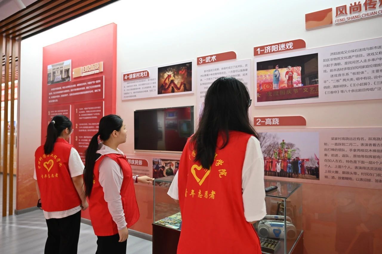 7月9日上午,志愿服务团的同学们参观了党心乡情展示馆,旨在探寻济阳的非物质文化遗产。在持续探索济阳非遗的过程中也逐渐深化了对新市镇的了解与认识。最后,在众多项目中,同学们发现了济阳迷戏、高跷、龙灯等瑰宝,并最终根据济阳迷戏的知名度和被纳入非物质文化遗产方面,决定济阳迷戏作为深入调研的核心对象,以便于后续深入调查和研究。