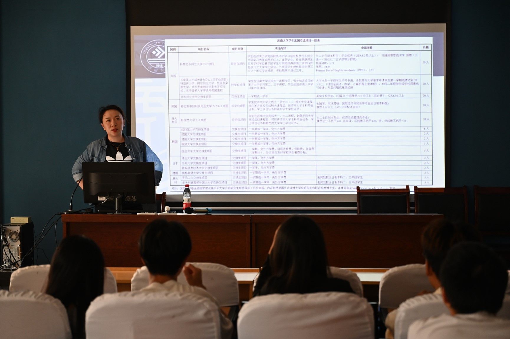 接下来由田老师介绍留学相关项目。田老师从项目的背景及意义、项目内容、参考行程、项目收获、学生成果及反馈这五个方面对出国实习项目进行了全面的讲解,大家受益匪浅。