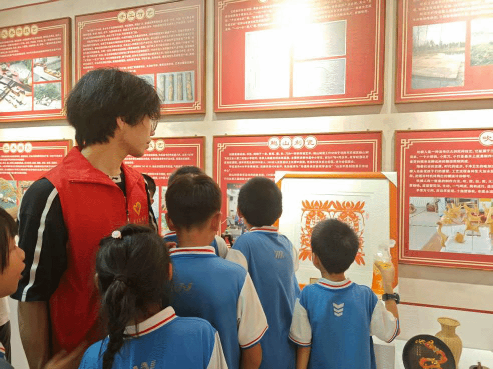 文化馆作为群众文化活动的重要阵地,设有音乐教室、舞蹈排练厅、美术活动室、非遗展示厅等丰富功能区域。在非遗展厅,孩子们饶有兴致地观看了历城本地传统美术和手工艺展品,如木版年画雕版、剪纸、泥塑等,近距离感受家乡优秀传统文化的深厚底蕴。不少孩子还动手尝试了简单的工艺制作,亲身体验了非遗技艺的精巧与传承价值。